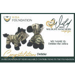 Debbie the Zebbie (Zebra) is a plush toy stitched with love locally from excellent quality materials. It is filled with super soft and clean fiber made from recycled plastic bottles collected from our local communities in South Africa.The toy measures 30cm x 20cm x 20cm and can sit by itself or stand on all fours. Each toy is tagged with a WRSA Foundation Tag.